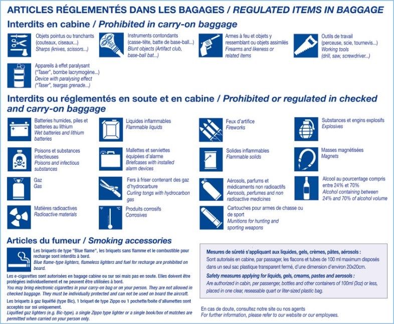 4. BAGAGES : Les bagages sont limités en fonction du type d’aéronef, par exemple 15kg par passager sur les jets légers. Le passager est responsable de ses bagages et assure à la compagnie de ne pas transporter de marchandises illégales ou dangereuses comme indiqué ci-dessous :